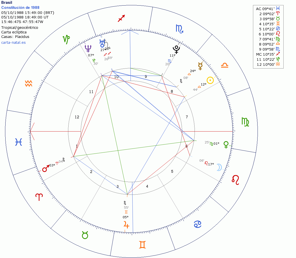 Marcello is a Brazilian astrologer and consultant, dealing with spiritual and karmic aspects of the horoscope. He taught as a professor at the first astrological college of South America, not yet accredited by the government. His main interest is in data collecting. (WEB ASTRODIENST)[/note], aunque hay que remarcar que en todas las cartas (la del Descubrimiento, la República y la Constitución) se destaca una fuerte presencia de la dualidad Tauro-Escorpión, los dos principales energías portadoras del 4º Rayo de Armonía y Belleza regente del Alma de la nación. Al final del articulo ofrecemos una breve reseña de estas tres cartas.