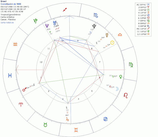 Esta carta* ya nos habla de un poderoso 4º Rayo como regente del Alma de Brasil a través de dos de sus portadores, Tauro y Escorpión. Si nos fijamos la linea de estos dos signos está muy activada y el poder regente en sus tres niveles de los planetas que los ocupan es enorme. Aunque quizás la regencia mas importante la ejerce Plutón en Escorpión como regente esotérico y jerárquico de Piscis y sin olvidar tampoco al planeta Tierra, situado también en Escorpión y regente jerárquico del importantísimo Venus en Géminis. También se puede observar de la importancia de Géminis Piscis como portadores del 2º Rayo de Amor Sabiduría regente de la personalidad del país. Diríamos que hay una mezcla importante de los dos rayos (Alma y Personalidad) pero que la regencia final se decanta por los dos signos portadores del 4R del Alma, Tauro Escorpión.