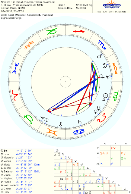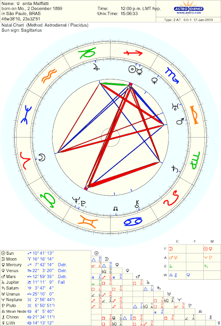 En la carta de la pintora Malfatti Venus en y a través de Escorpión es el regente exotérico de los planetas en Libra, el regente esotérico de Géminis donde está la Tierra como la regente esotérica del Sol en Sagitario y finalmente también es el regente jerárquico de Capricornio donde está Júpiter el regente exotérico del Sol.