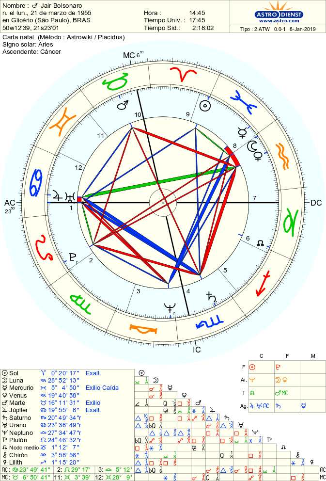 Podemos pensar pues que Urano en Tauro trajo el actual presidente de Brasil, un presidente de talante conservador que a través de sus reaccionarias y polémicas opiniones ha aglutinado el desencanto de una parte importante de la población independientemente de la ideología que esta procesa. Aunque también podemos pensar al revés, y decir que Bolsonaro es la victima propicia para que dicho desencanto se muestre a través de un líder hasta hace poco tiempo considerado de segunda fila.