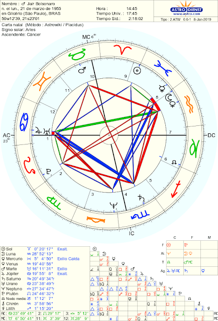 Con las actitudes y opiniones excluyentes que Bolsonaro expresa no podemos pensar que el sea muy consciente de su alma o del significado esotérico que para su alma tiene Cáncer/Neptuno en Libra, sino que mas bien podemos pensar que el es el brillante poder de su sol (personalidad) exaltado en Aries, regido o condicionado por cierta compulsión taurina errática reflejada en la caída de Marte opuesto a Saturno. Recordad que un planeta en caída o en mal estado cósmico y los errores personales que ello implica solo puede ser transmutado desde la conciencia no interesada del Alma.